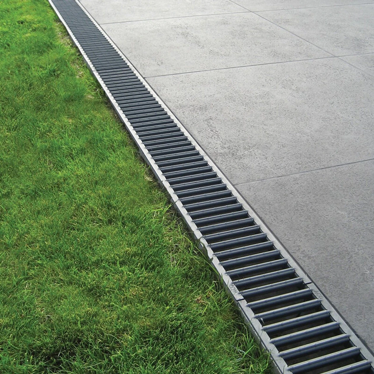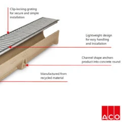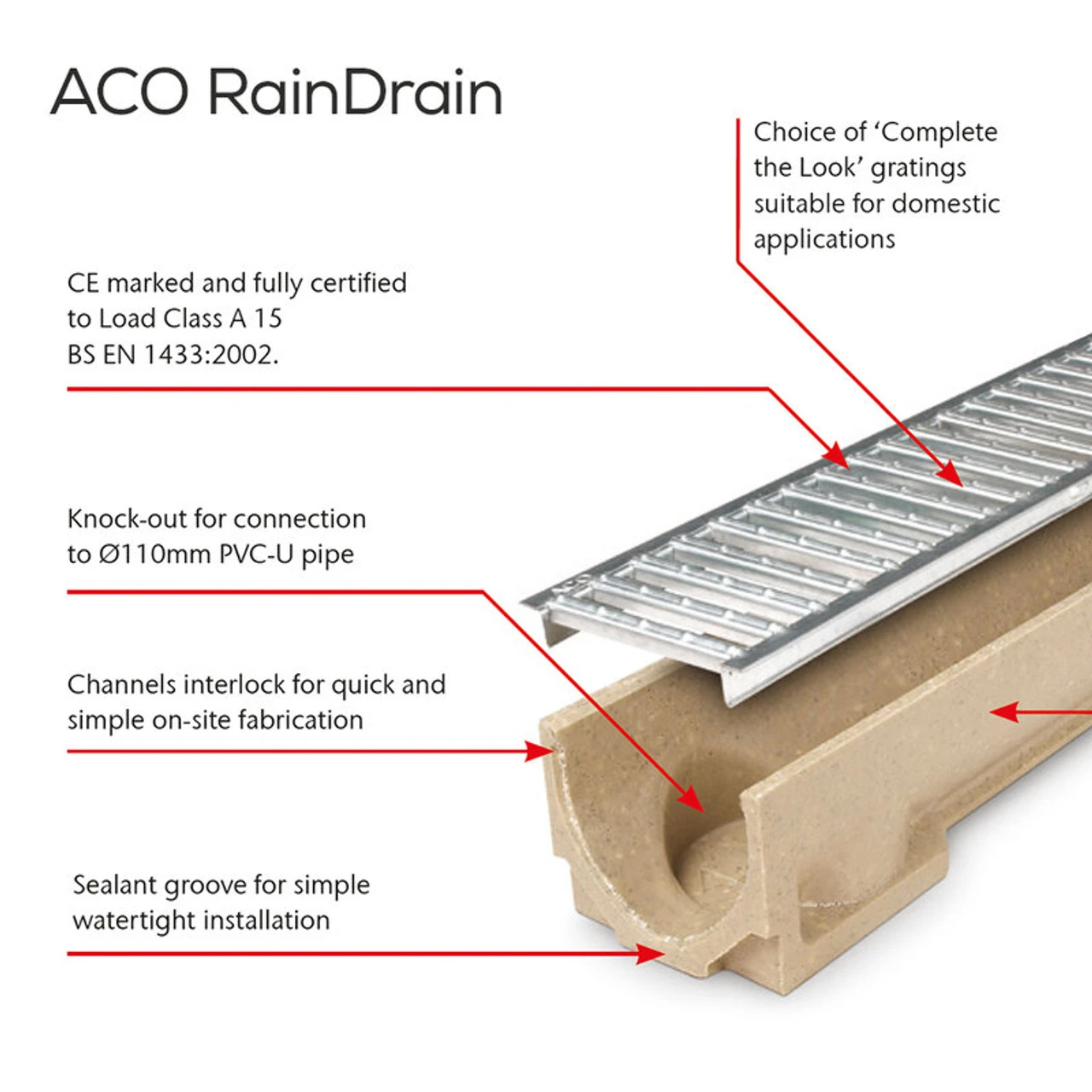 The 1m ACO RainDrain Channel is manufactured using Vienite, ACO’s high-strength polymer concrete and features galvanised steel grating and is certified to load class A15. It is suitable for use in paved pedestrian areas, as well as areas that experience low levels of light domestic vehicle traffic such as private garage thresholds. The channels interlock easily with each other for a speedy installation. It includes a knock-out that allow you to connect 110mm PVC-U piping to the channel. The profile is designed to improve the speed with which water passes through it whilst promoting self-cleansing. To end a run of channel, you should use Closing End Caps. These will stop leakages and are sold separately.