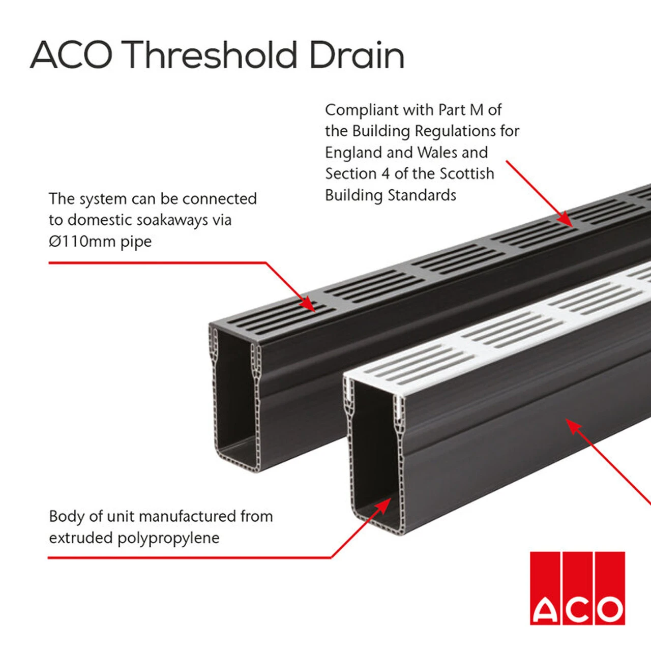 ACO Threshold Drain Corner Unit Assembly with Black Aluminium Grating. ACO Threshold Drain eliminates water ponding at house entrances. The discreet system has a width of 60mm and is available in 1m lengths, and with a range of accessories available from corner units to vertical outlets, it is now possible to use as part of a modern patio drainage system The system is compliant with Part M of the Building Regulations for England and Wales and Section 4 of the Scottish Building Standards.