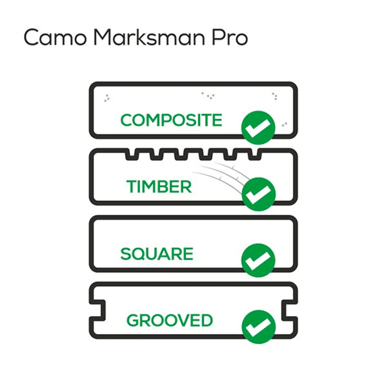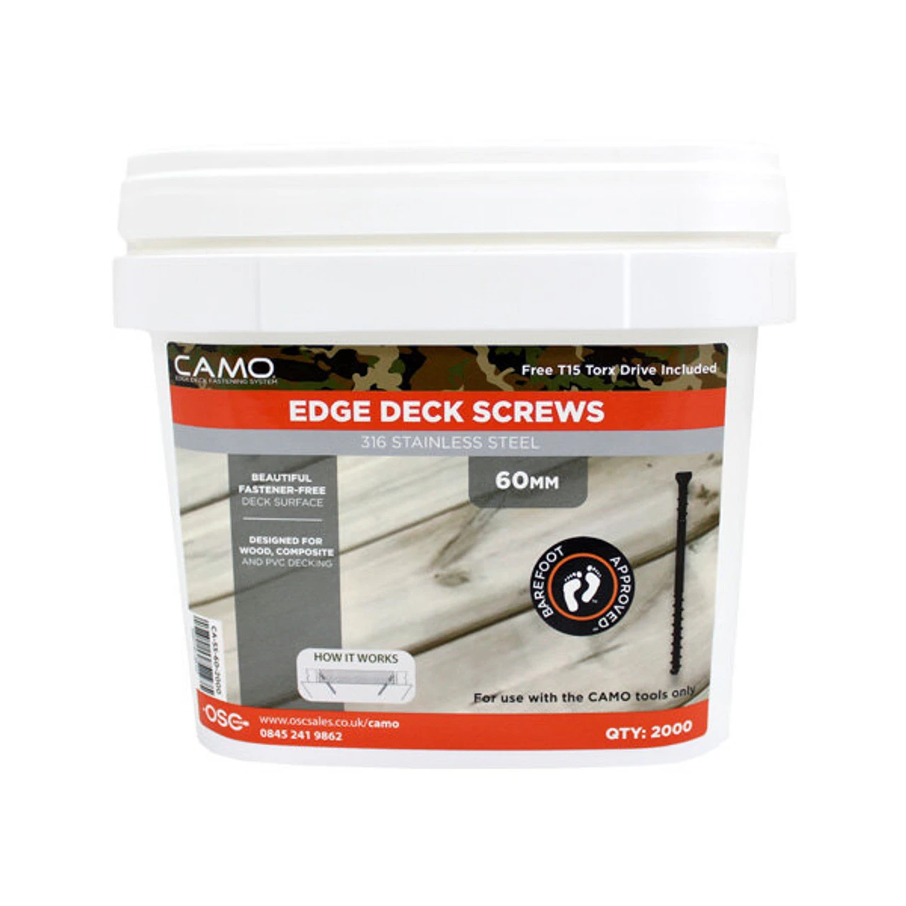 The 60mm CAMO Pack of 2000 Stainless Steel Deck Screws have a Protech coating and are ideal for use in a wide variety of decking materials that have a board depth of 32-50mm, including composite, PVC and hardwoods such as oak and balau. Stainless Steel Screws are used if you intend to place your decked area around or near a swimming pool, or if you live close to the sea. Otherwise, Protech coated screws are suitable in all other decking situations. Pre-drilling is not required in most cases, however, we do advise pre-drilling for some hardwoods such as Tigerwood, Ironwood, Cumaru and IPE. The CAMO range is barefoot approved, so you don’t have to worry about your family’s feet catching any sharp screw edges during the summer months. Please note that only official CAMO deck screws are suitable for use with the CAMO Marksman Pro as they have been engineered to work together. Using products from other brands may not produce the highest-quality results. The box includes two driver bits, however grooved board driver bits can be purchased separately.