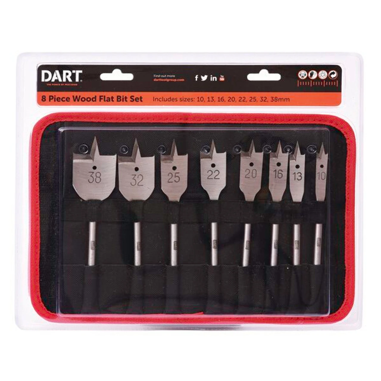 The DART 8 Piece Flat Bit Set contains eight Flat Bits in the following sizes: 10mm, 12mm, 16mm, 18mm, 20mm, 25mm, 32mm and 38mm. Each Flat Bit is precision engineered and features double side spurs that help ensure cutting is quick and precise. They can be used in a variety of cutting applications including plastic, wood and plasterboard.