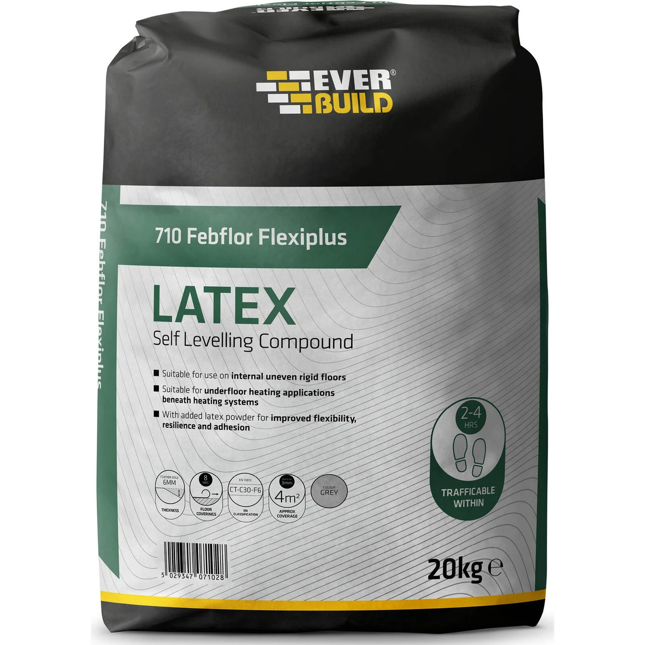 710 Self Level Flexiplus is a floor levelling compound that makes the job easier by self-levelling and self-smoothing with improved flexibility. Febflor Flexiplus Latex is used to level out internal uneven floors, including those with a small amount of movement. This product is perfect for asphalt or tar based surfaces and can also be used beneath underfloor heating systems. The product sets fully in 3-4 hours and can be foot trafficable in 2-4 hours.