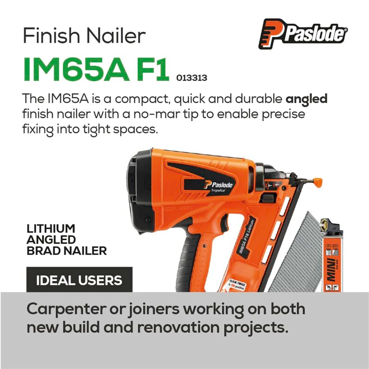 Be the first to review “Paslode IM65A F16 Lithium Angled Finishing Nailer (013313)” Cancel reply