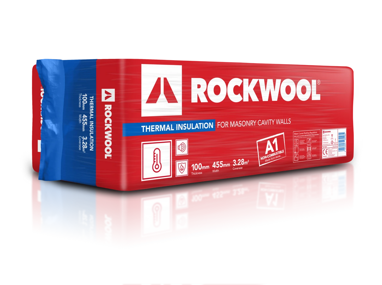 The Rockwool Thermal Insulation Cavity Batt 100 x 455 x 1200mm is an A1 fire rated Thermal protection insulation for masonry cavity walls. ROCKWOOL Thermal Cavity Batts are a semi-rigid full fill insulation solution for use in external and party masonry cavity walls. The batts are quick and easy to cut, and provide a great fit, reducing installation time, avoiding gaps and cold spots, thereby maximising long-term performance. High water repellence prevents the transfer of moisture from the outer to the inner leaf of the wall, helping preventing rot and mould. The batts are Euroclass A1 non-combustible. The batts are quick and easy to cut, and provide a great fit, reducing installation time, avoiding gaps and cold spots, and maximising long-term performance. Water repellence stops the transfer of moisture from the outer to the inner leaf of the wall, preventing rot and mould.