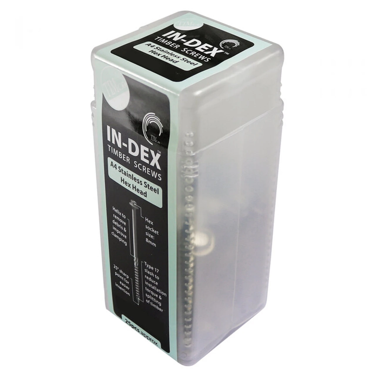 TIMco In-Dex Timber screws are designed as an alternative to the traditional coach screw, it is ideal for timber-to-timber applications of decking, stairs, roofing, and landscaping. This screw has been manufactured from A4 stainless steel which provides ultimate corrosion resistance. It has a 50 degree deep single thread to provide a secure fixing with high pull-out resistance from splitting the wood. The 25-degree sharp point enables easier access into all wood types.