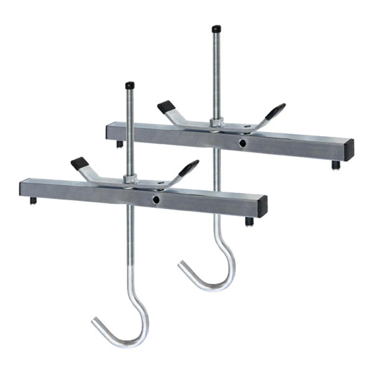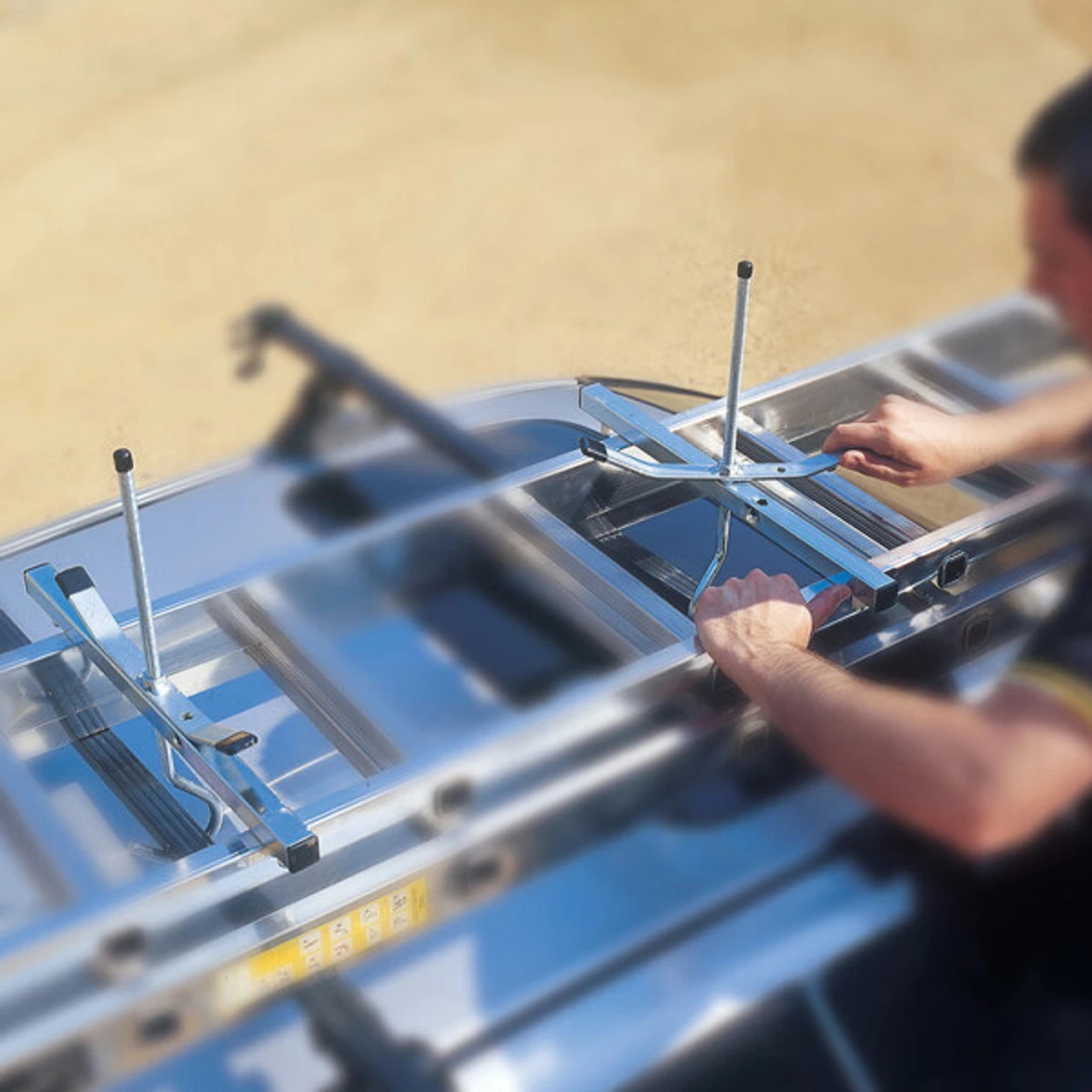 The 30389800 Ladder Rack Clamp ensures safe and easy transportation of most ladders on a motor vehicle, freeing up interior vehicle space.The simple aluminium hooks attach to your roof rack bars and the aluminium crossbar screws downward to your required height, clamping the ladders securely in place. Fits Ladder sections up to 0.38m wide.